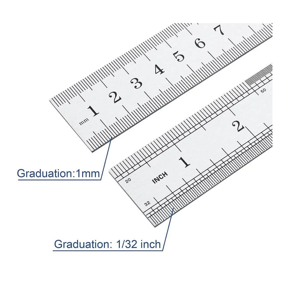 Paslanmaz çelik çift taraflı cetvel, bir yüzünde santimetre ve milimetre, diğer yüzünde inç ölçekleriyle tasarlanmış olup, farklı ölçüm sistemlerine kolaylıkla uyum sağlar.