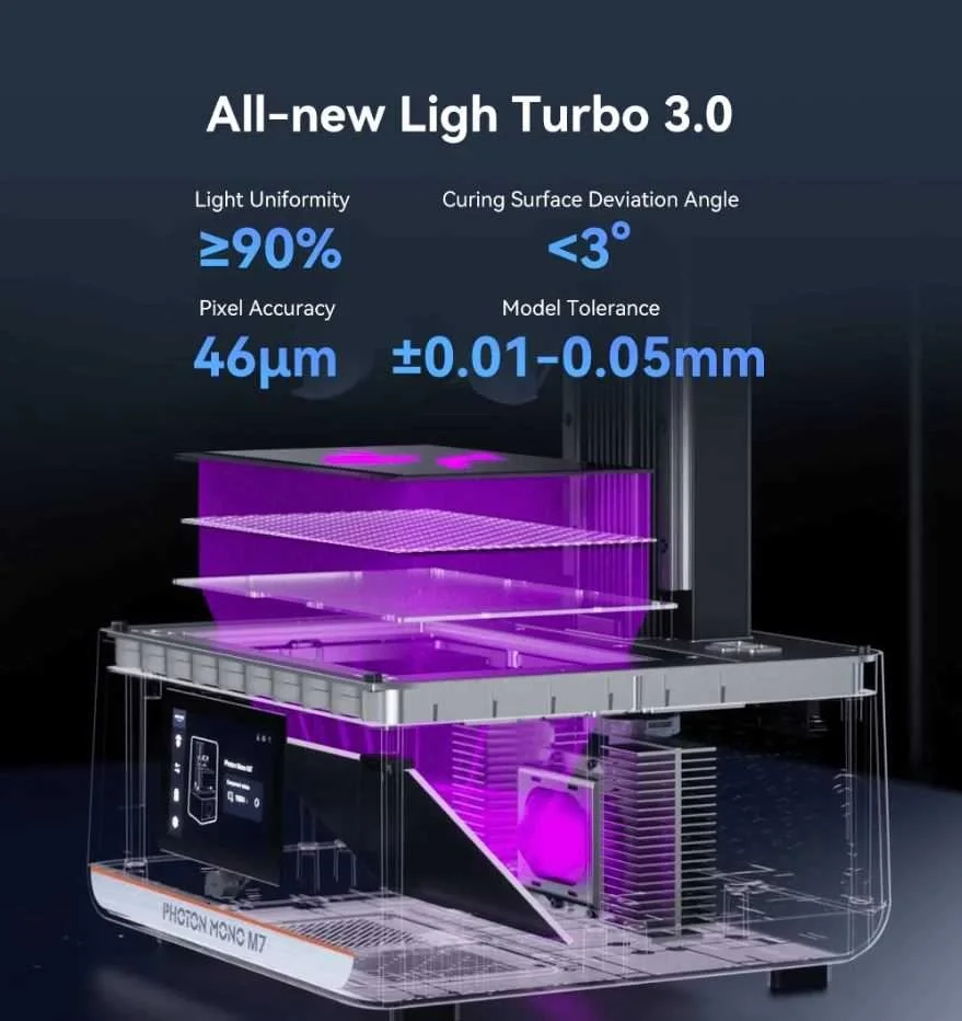 Yeni geliştirilen High-Speed Resin 2.0 ile birlikte çalışan Photon Mono M7, 150mm/s baskı hızıyla rakipsiz bir performans sunar. Bu yüksek hız, gelişmiş LighTurbo 3.0 ışık kaynağı teknolojisi ve optimize edilmiş yazılım algoritmaları ile desteklenir. Reçine baskı dünyasında zamanı en verimli şekilde kullanmak isteyenler için devrim niteliğinde.