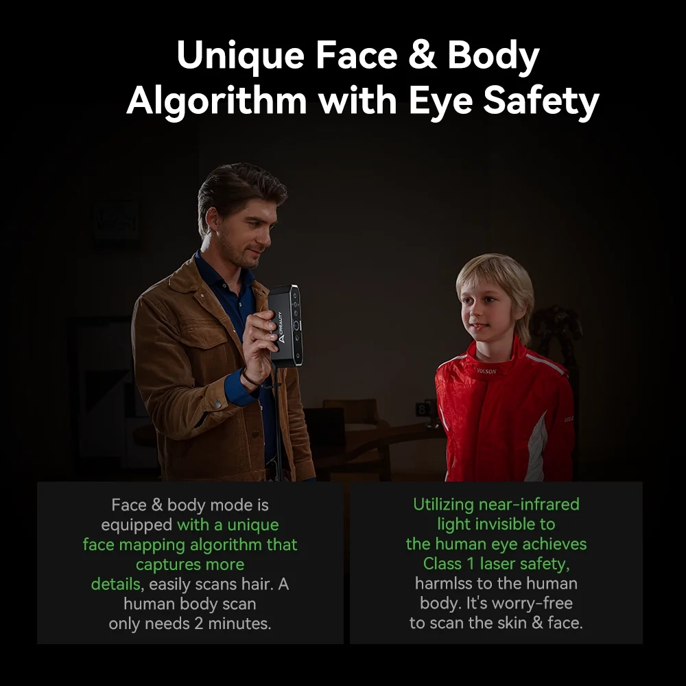 Yüz ve vücut modu, daha iyi ayrıntı yakalama için benzersiz bir yüz görüntüleme algoritması içerir. CR-Scan Otter ile tüm insan vücudu sadece 2 dakikada taranabilir.