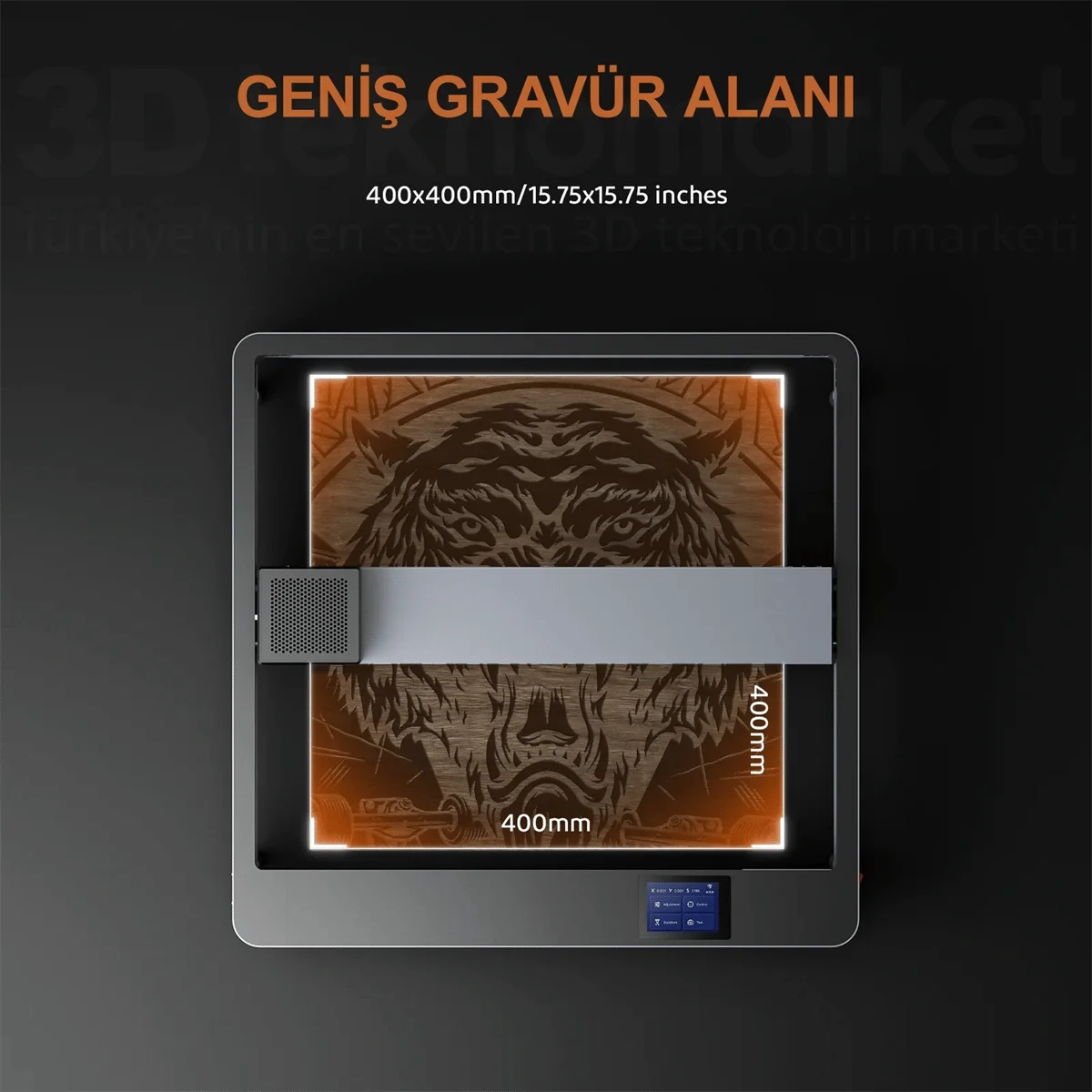 Geniş Gravür Alanı: Makine ayrıca 400 x 400 mm /15,75x15,75 inçlik cömert bir gravür alanına sahiptir ve size büyük projeleri üstlenmeniz veya aynı anda birden fazla parçayı gravür etmeniz için yaratıcı özgürlük verir. Ayrıca, yüksekliği ayarlanabilen lazer kafası ve ayarlanabilir yükselticileri, farklı yükseklikteki nesneleri kolaylıkla kazımanızı sağlar.