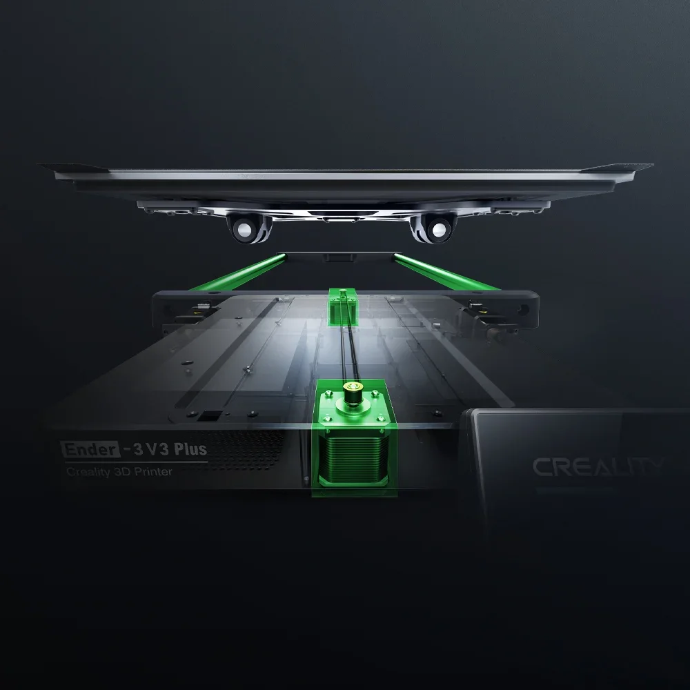 Yazıcının gantry ve tabanı, sağlam bir üçgen şeklinde tek bir alüminyum alaşımlı döküm parçadan yapılmıştır. İki ek destek çubuğu, genel yapının stabilitesini artırır ve Z ekseninin sallanmasını azaltır. Birkaç vida ve yuvarlatılmış köşeler, Ender 3 V3 Plus'a zarif bir görünüm kazandırır.