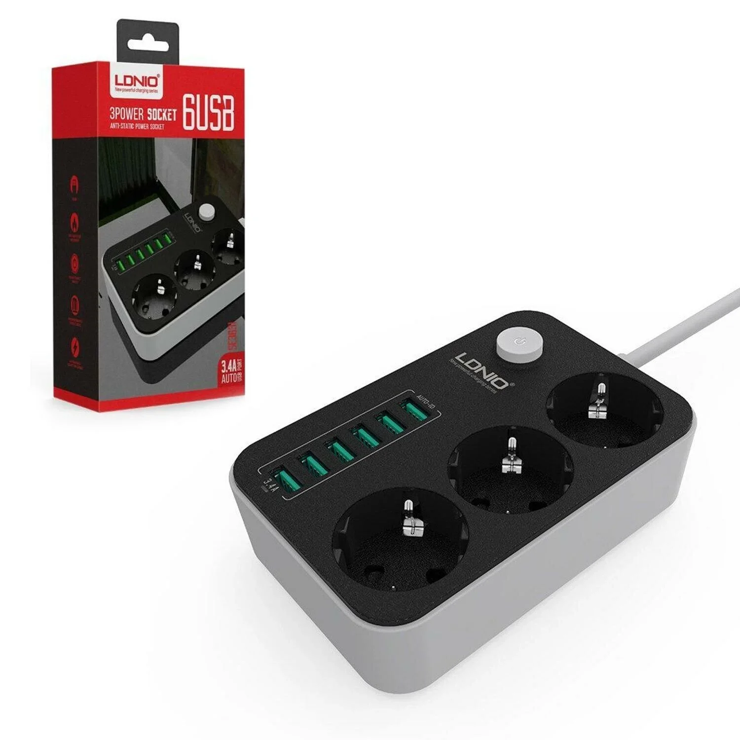 LDNIO 6 USB GİRİŞLİ 3LÜ AKIM KORUMALI PRİZ  SE3631
