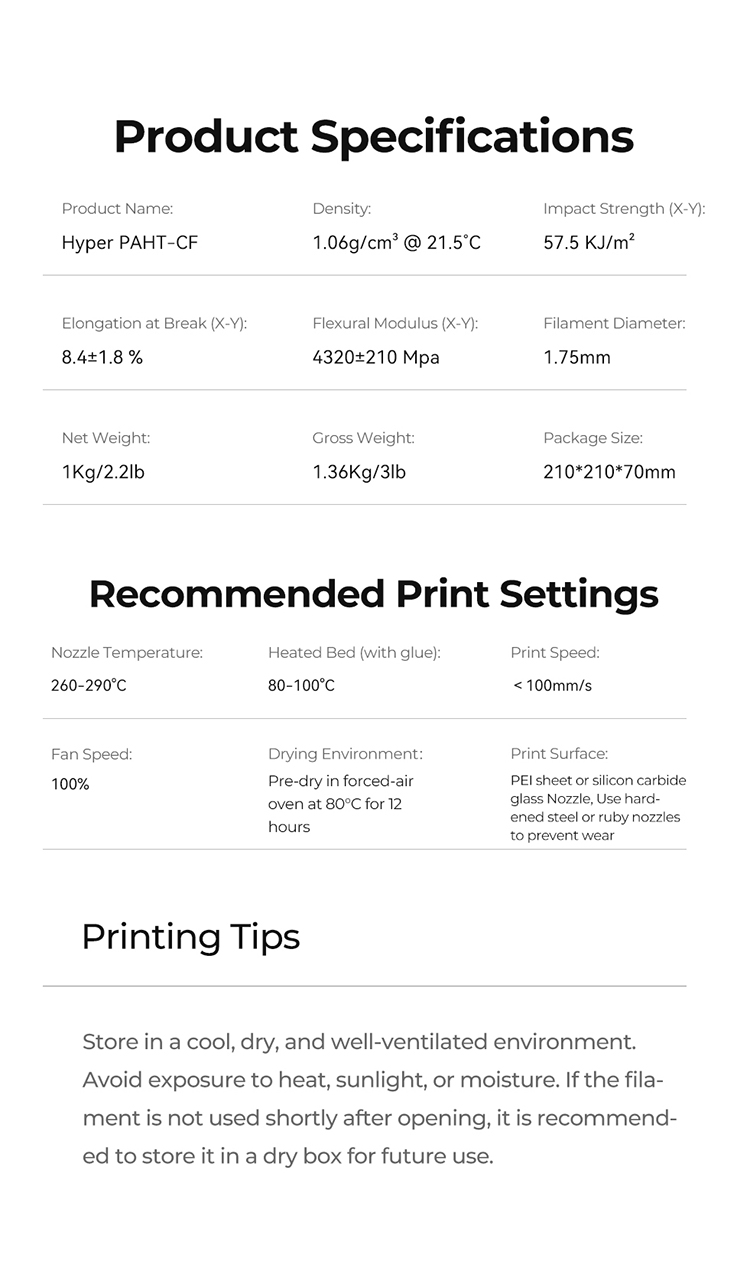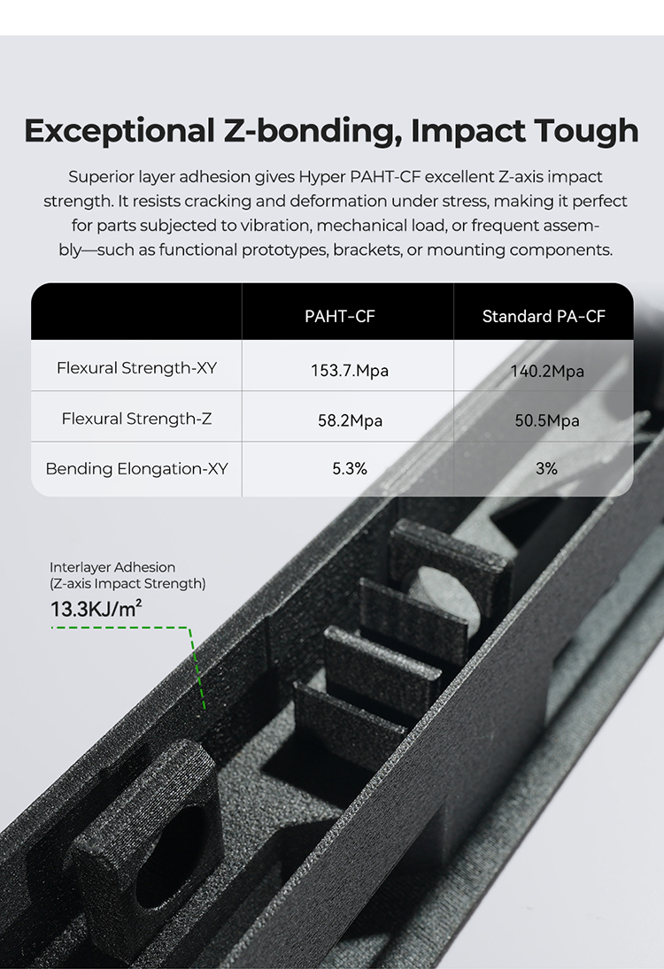 Creality Hyper PAHT-CF, endüstriyel uygulamalar için geliştirilmiş, karbon fiber takviyeli yüksek performanslı bir mühendislik filamentidir. PAHT (Polyamide High Temperature) bazlı yapısı sayesinde üstün ısı dayanımı, yüksek mekanik mukavemet ve olağanüstü boyutsal kararlılık sunar.