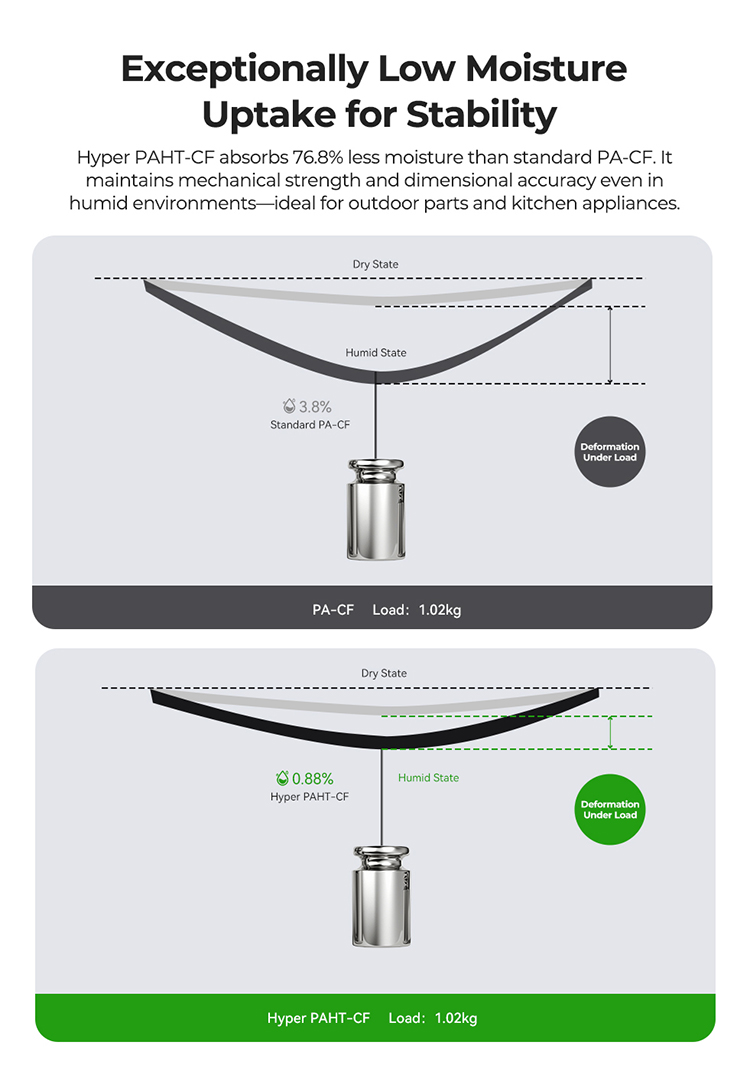 Karbon fiber katkısı sayesinde Hyper PAHT-CF, standart naylon filamentlere kıyasla çok daha rijit ve darbe dayanımı yüksek parçalar üretir. Isıya maruz kalan ortamlarda formunu korur ve uzun süreli kullanımlarda deformasyon göstermez.