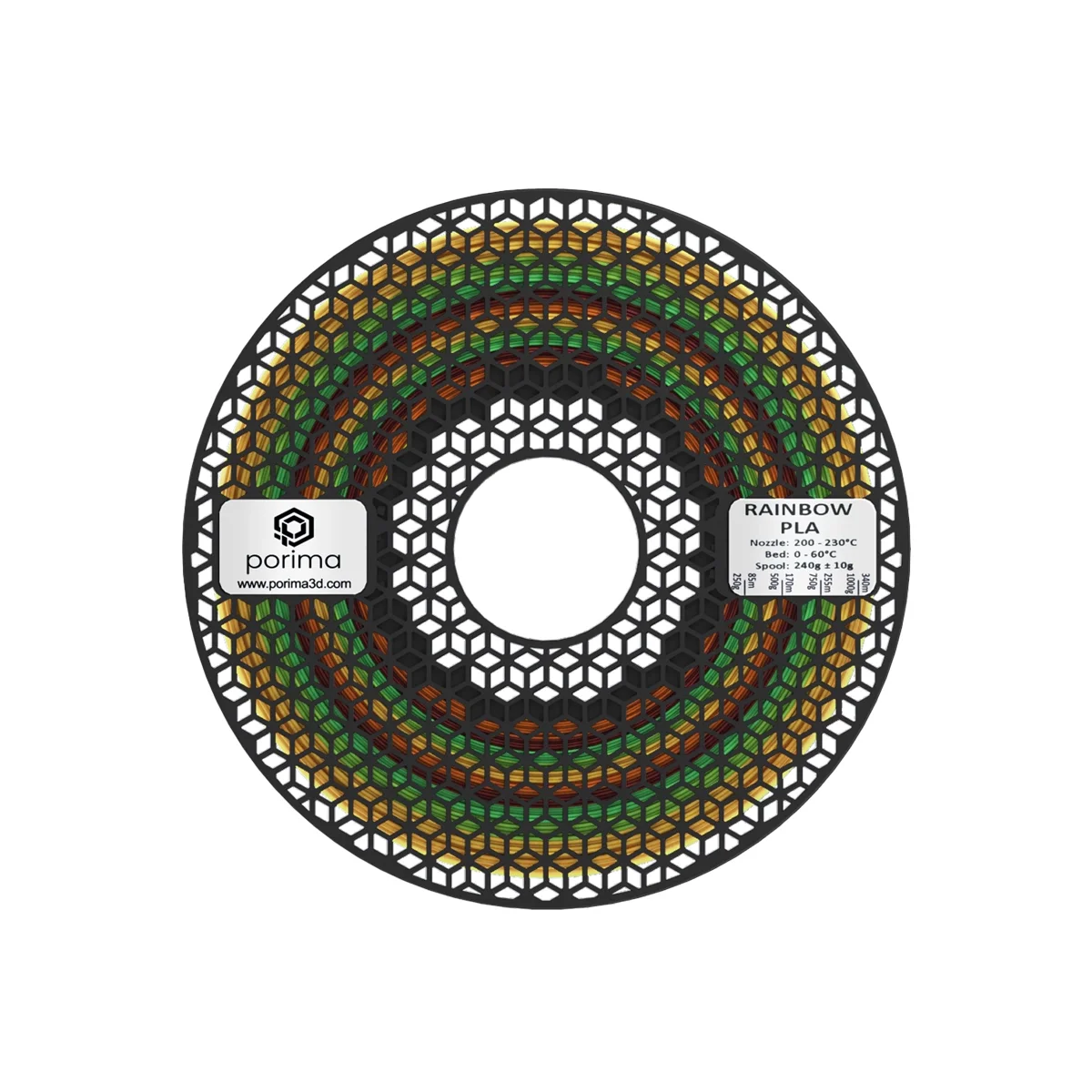 Porima Rainbow PLA Pastel Filament, yumuşak ve soluk tonlardaki renk geçişleriyle dekoratif ve estetik baskılar için özel olarak tasarlanmıştır. Parlaklığı ve doygunluğu düşük pastel tonlar ile üretildiği için görsel açıdan sade ama çarpıcı sonuçlar sunar. Bu seri, standart Porima PLA filamentlerin tüm avantajlarını taşımaktadır.