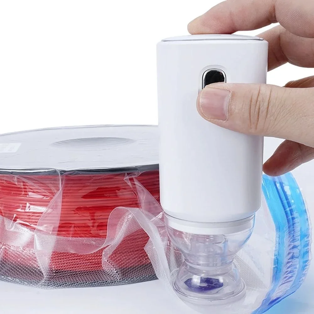 Elektrikli vakum pompası yüksek emiş gücüyle 3D yazıcı filament torbalarınızdan havayı hızla çeker. Tek yapmanız gereken pompayı torbanın valfine hizalayıp güç düğmesine basmak. Kolay ve etkili vakumlama sağlar.