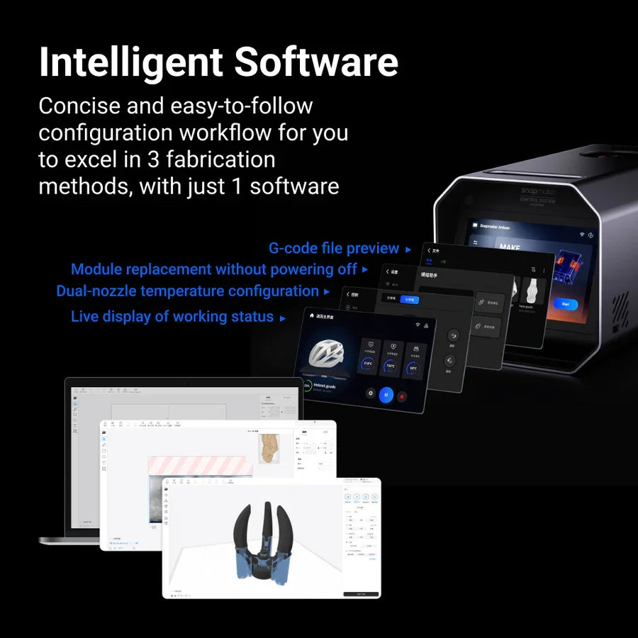 Snapmaker, kendi geliştirdiği Luban yazılımıyla tek bir yazılım parçasıyla 3D baskı, lazer ve CNC işleme için yapılandırma akışlarına genel bir bakış sağlamayı mümkün kılar.