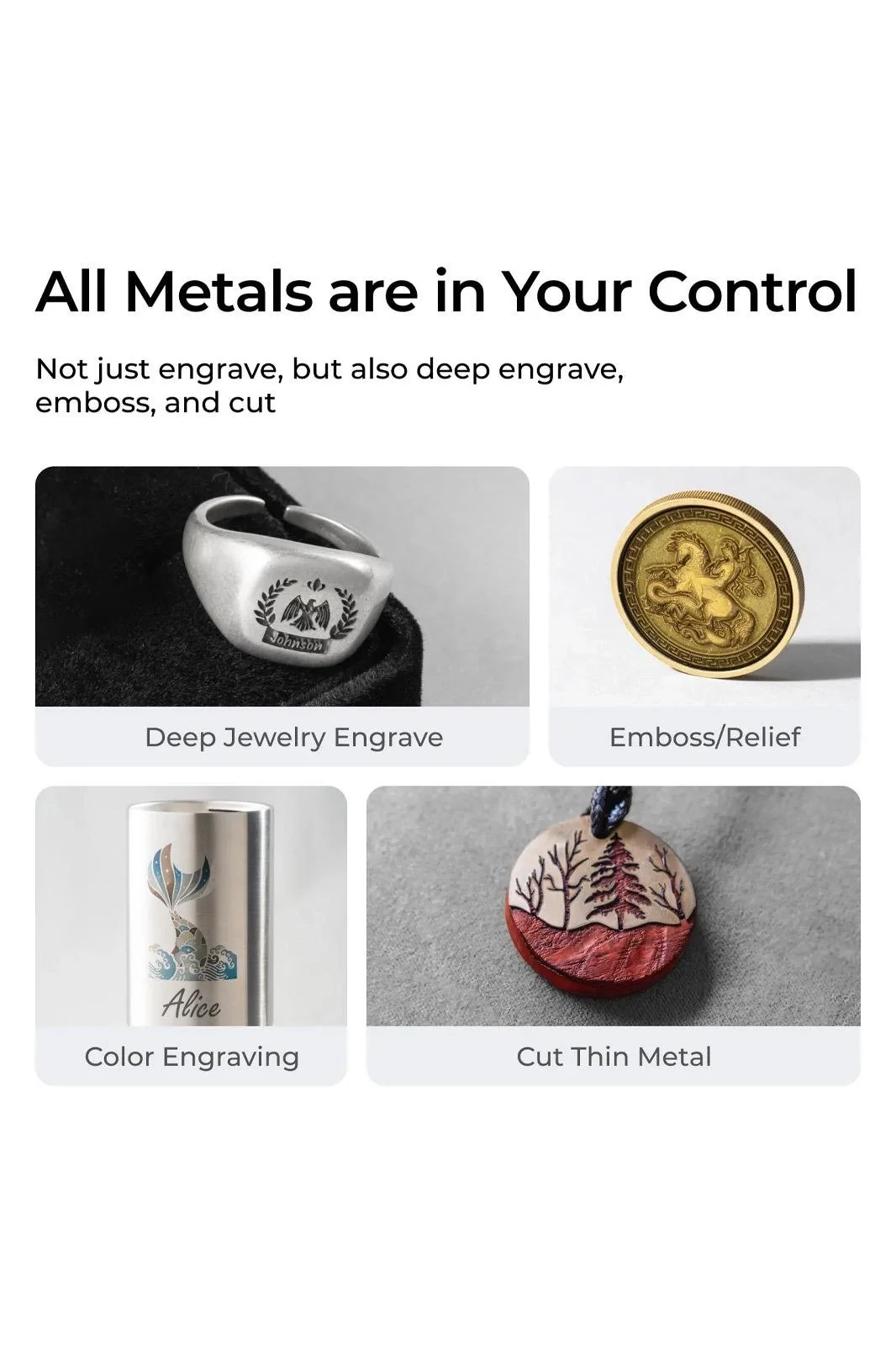 Her iki lazer de metal üzerinde renkli kazıma destekler, tasarımları canlı renklerle hayata geçirir.