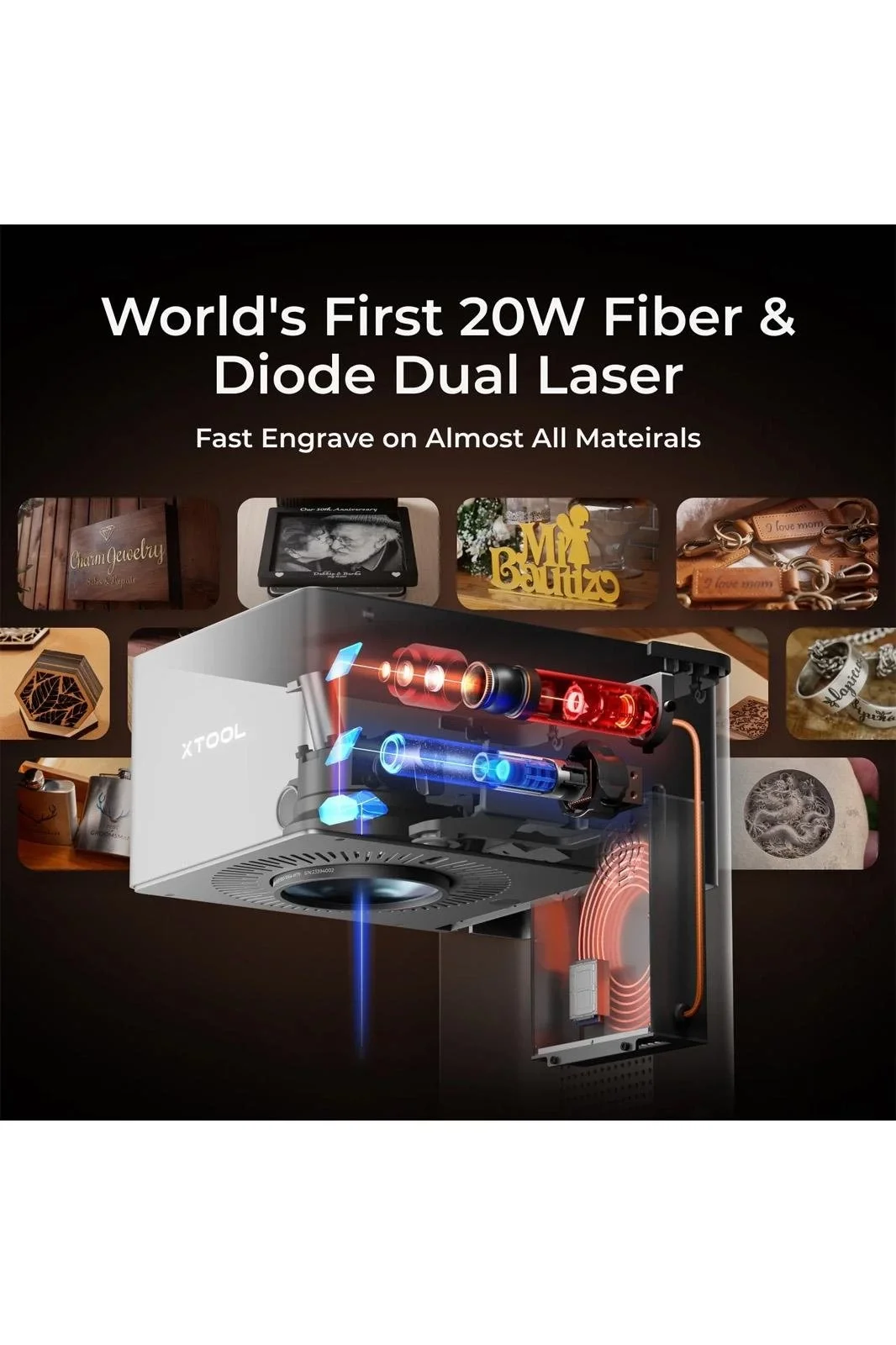 20W fiber ve 20W mavi diyot lazerleri ile donatılan xTool F1 Ultra, geniş bir malzeme yelpazesinde kazıma ve kesim yapabilme yeteneğine sahiptir. Fiber lazer, paslanmaz çelik, alüminyum, altın gibi metallerde mükemmel kazıma yaparken, diyot lazer, ahşap, akrilik, deri, cam, seramik ve kaya gibi yaygın olmayan metal malzemelerde işlem yapabilir.
