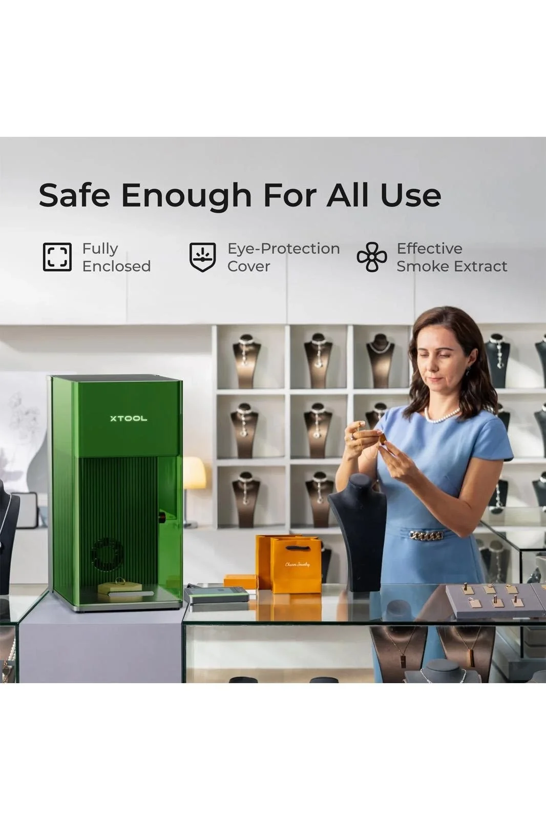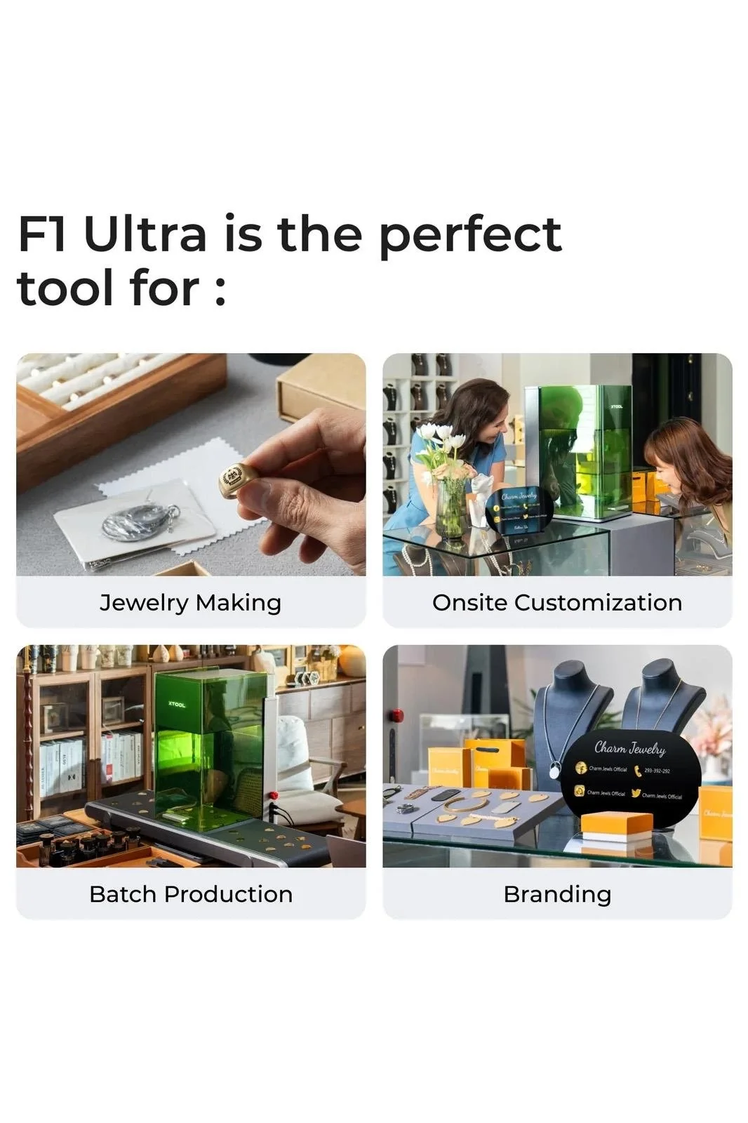 xTool F1 Ultra, hediyeler, hatıra eşyaları, takılar, oyuncaklar ve giyim gibi geniş bir ürün yelpazesinde özelleştirme yapmak için idealdir. Mağazalar, atölyeler, fuarlar ve diğer ortamlarda kullanım için çözüm sunar. Güçlü özellikleri ve kullanımı kolay olması, hassasiyet ve verimlilikle üretimini ölçeklendirmek isteyen her işletme için mükemmel bir çözüm sunar.