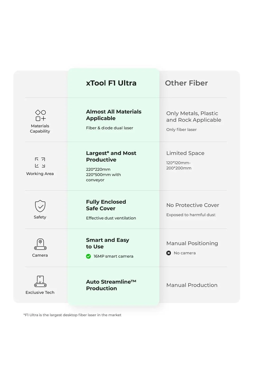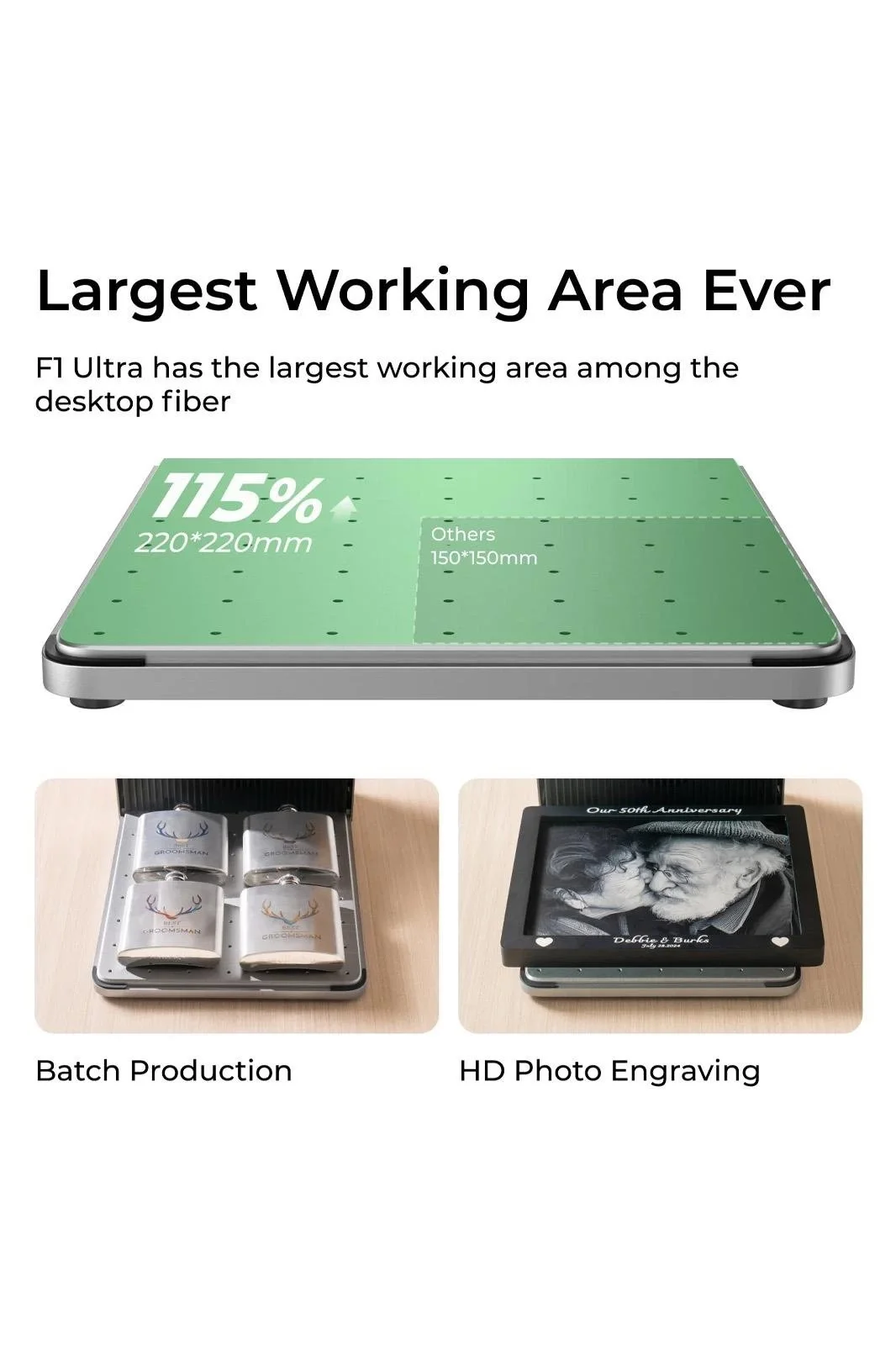 xTool F1 Ultra, sınıfındaki en büyük çalışma alanına sahip olup, 220 mm x 220 mm'lik bir alana sahiptir ve Auto Conveyor (ayrı olarak satılır) eklenerek bu alan 220 mm x 500 mm'ye kadar genişletilebilir. Bu geniş çalışma alanı, büyük projelerin detaylardan ödün vermeden tamamlanmasını sağlar.