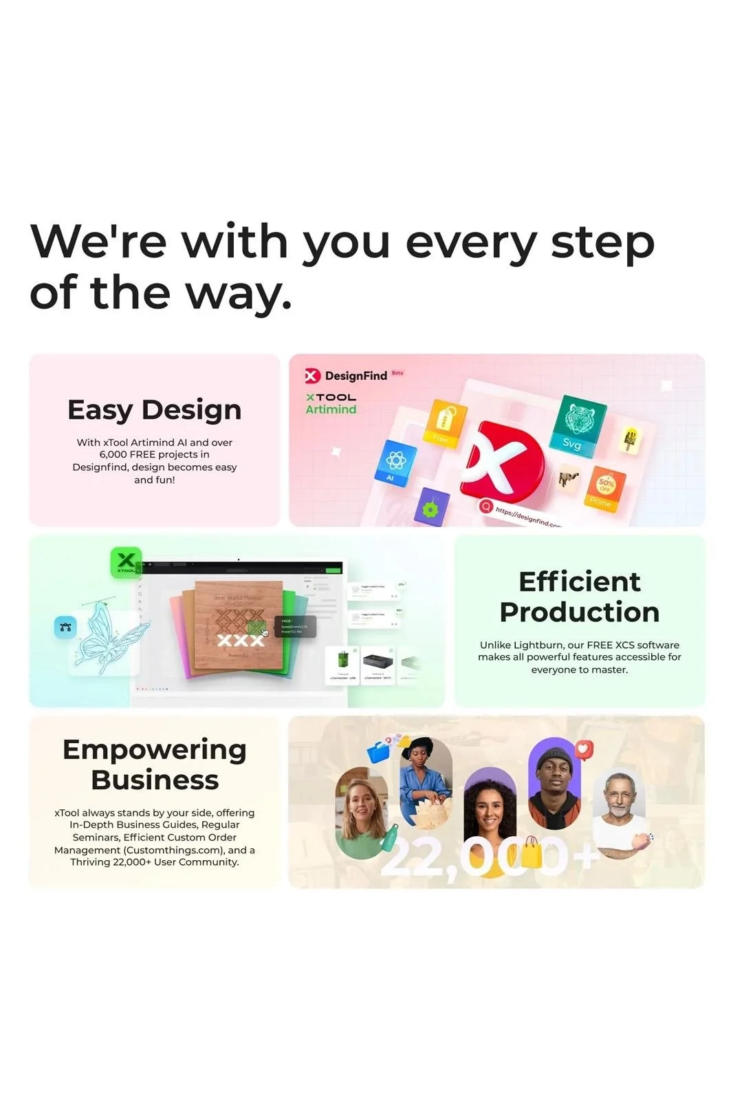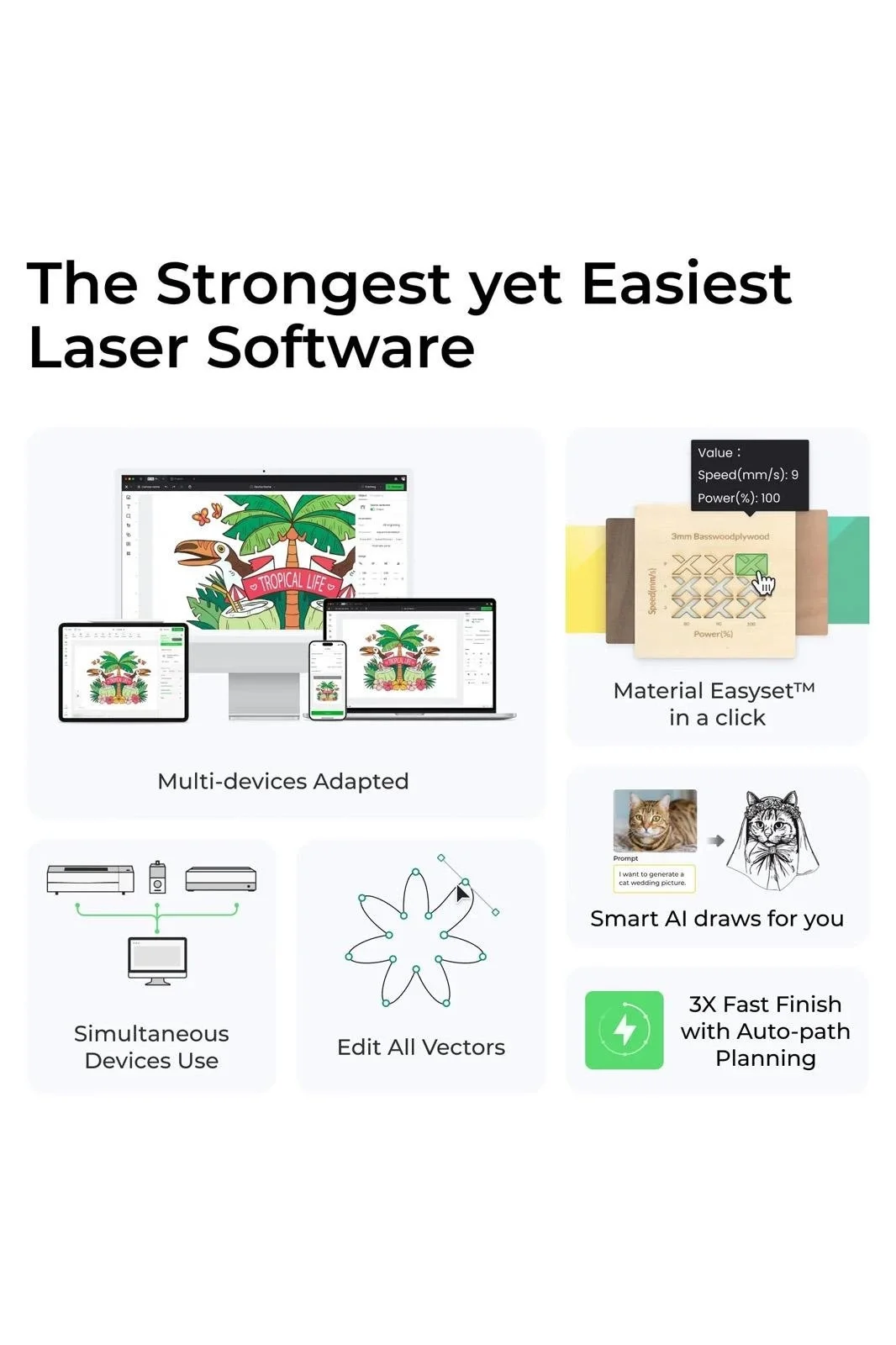 xTool Creative Space Yazılımı, hızlı tasarım oluşturmak için yapay zeka araçları entegre eder ve sistem, tasarım yerleşimini hassas bir şekilde yapmak için Smart Fill gibi akıllı işlevleri destekler. Cihaz, herhangi bir ortamda güvenli çalışmayı sağlamak için tamamen kapalı bir gövde tasarımına sahiptir ve zararlı lazer ışığına maruz kalmayı önler.