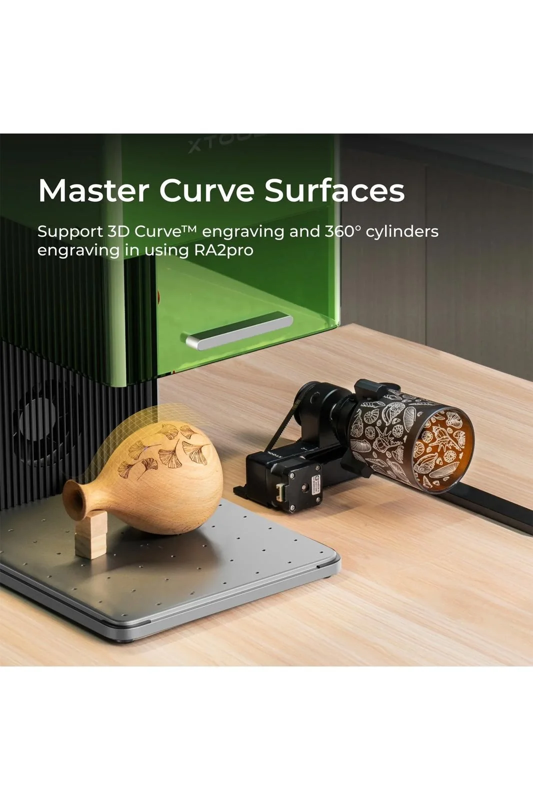 3D Curve™ Kazıma özelliği, her türlü eğri yüzeyde kazıma yapmayı sağlar, örneğin bardaklar, kupalar, yüzükler gibi öğelere desenler kazımak için otomatik olarak 3D modeller oluşturur.